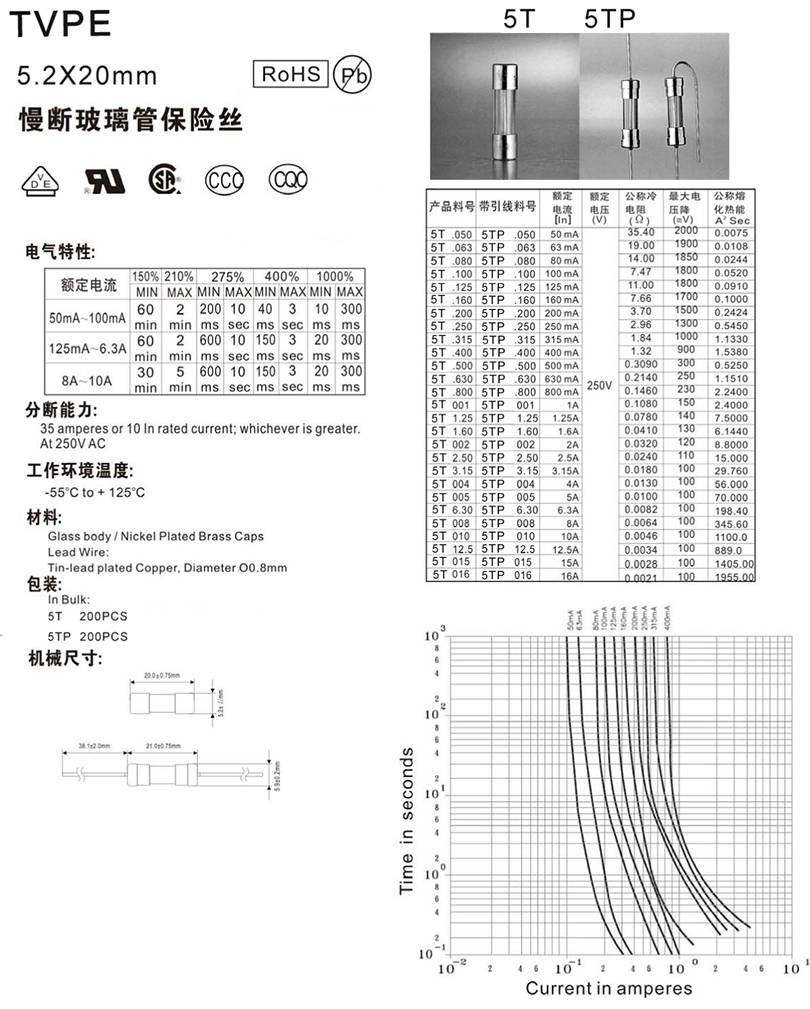 5.2X20mm玻璃慢斷保險絲